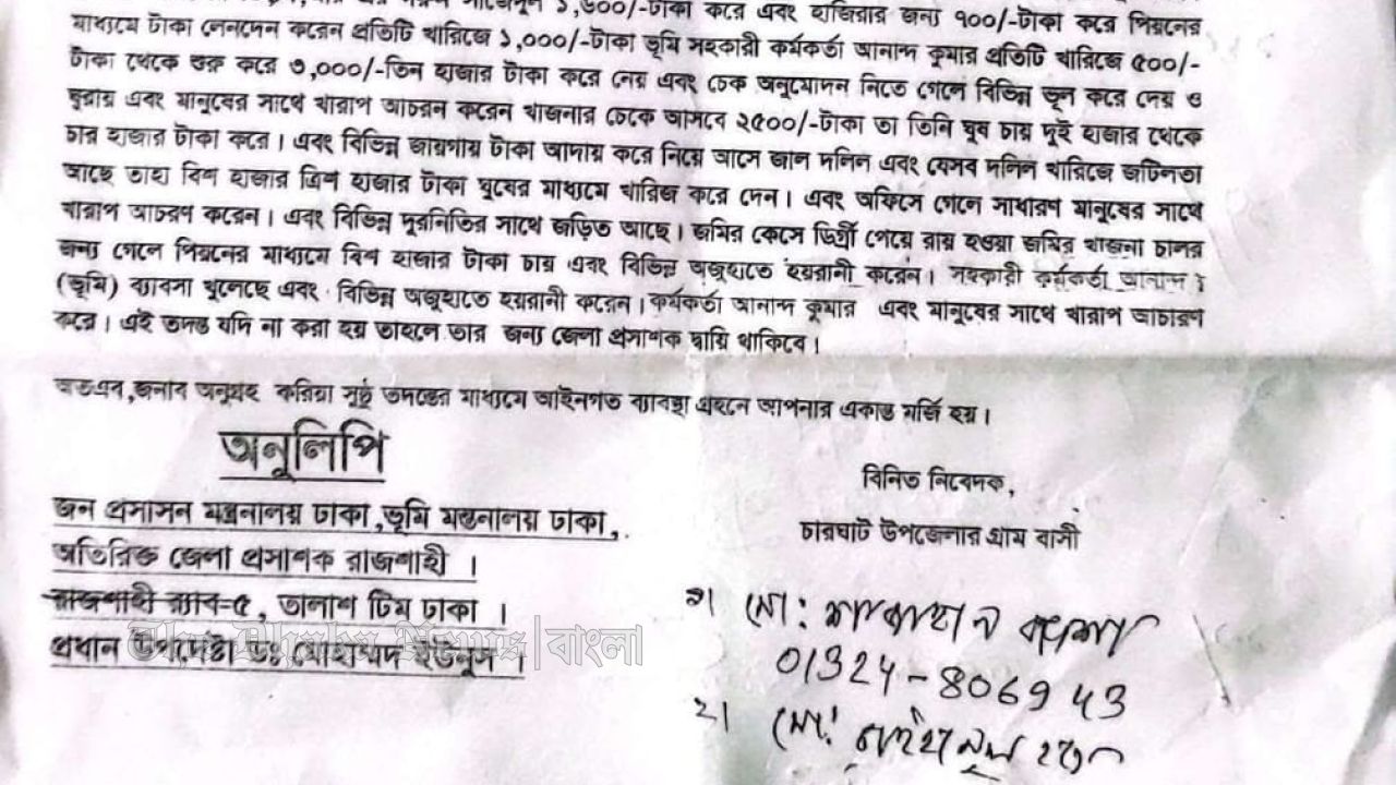 গ্রামবাসীর লিখিত অভিযোগে জানানো হয়, ইউনিয়ন ভূমি সহকারী কর্মকর্তা আনন্দ কুমার প্রতিটি নামজারি কেস জমা দিতে গেলে শুরুতেই ১,০০০ থেকে ৫,০০০ টাকা হাতিয়ে নেন। খাজনার চেক অনুমোদন করতে গেলেও বিক্রম নামের এক ব্যক্তির মাধ্যমে ১,০০০ টাকা করে দাবি করা হয়। নামজারি বা মিস কেসের জটিলতা ভেদে এই ঘুষের অঙ্ক ৫০,০০০ থেকে শুরু করে ২,০০,০০০ টাকা পর্যন্ত পৌঁছায়।