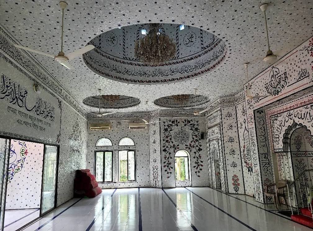 মসজিদের ভেতরের পাঁচটি গম্বুজে সুনিপুণভাবে লেখা হয়েছেআয়াতুল কুরসি, সুরা আর-রাহমান এবং চার কুল।বাইরের আবরণে চাঁদ-তারার নকশা মুঘল, তুর্কি ও পারস্যস্থাপত্যশৈলীর অনুকরণে তৈরি করা হয়েছে।